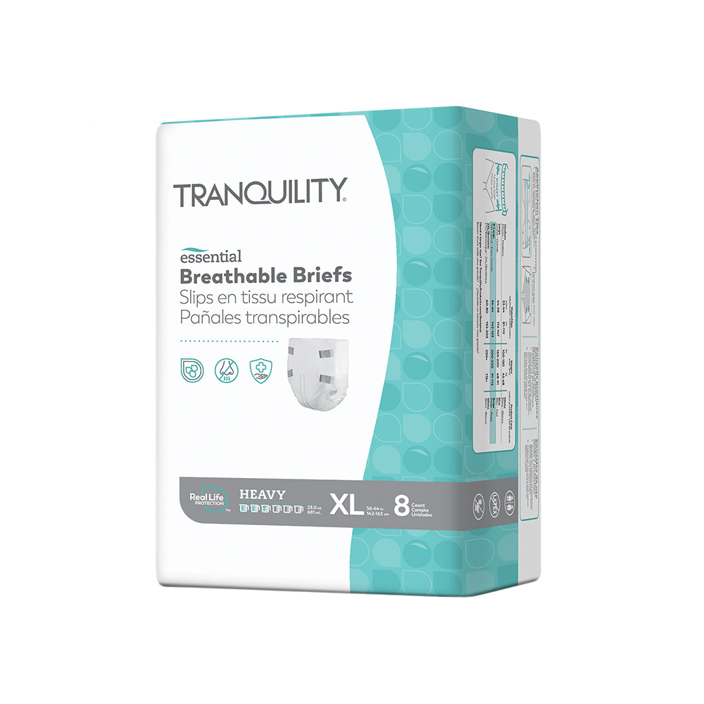 Tranquility® Essential Breathable Briefs are a soft and breathable tab-style product offering secure protection where you need it. These briefs feature breathable side panels and refastenable tabs for a comfortable fit. Kufguards® channel and lock in fluid to keep you dry. Recommended for individuals with heavy incontinence. Latex-free.